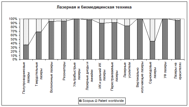 В области лазерной техники колоссальными темпами развиваются полупроводниковые, перестраиваемые и одномодовые лазеры, а также лазеры ИК диапазона (рис. 3). В области применения лазеров в медицине наибольшая активность принадлежит вопросам лазерной терапии; активно осваивается офтальмология, дерматология, фотодинамическая терапия, лазерная томография.
