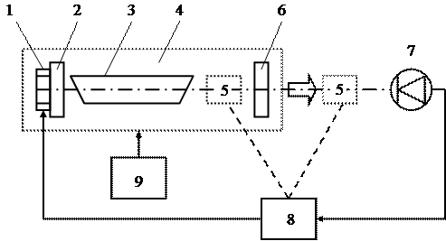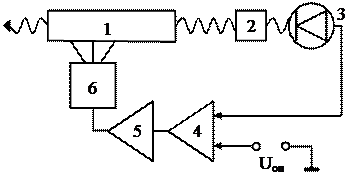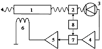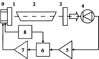| Рис 1.6. Функциональная схема частотно-стабилизированного лазера: 1 – управляющий элемент; 2,6 – зеркала; 3 – активный элемент лазера; 4 – излучатель; 5 – оптический дискриминатор; 7 – фотоприёмник; 8 – система АПЧ; 9 – блок питания активного элемента и пассивной стабилизации частоты |