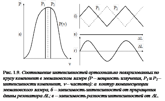 В продольном магнитном поле контур линии люминесценции расщепляется на два, взаимодействующих с излучением только одной из круговых поляризаций (эффект Зеемана). Одночастотный лазер становится двухчастотным, так как каждая из частот излучения лазера при этом расщепляется на две, отличающиеся примерно на 0,1 % расщепления контуров люминесценции. Излучение каждой компоненты ортогонально поляризовано по кругу. При настройке резонатора на центр нерасщепленного контура люминесценции обе зеемановские компоненты излучения лазера имеют одинаковую интенсивность. При расстройке резонатора интенсивности компонент меняются в противофазе, что используется для формирования сигнала ошибки в системе АПЧ (рис. 1.9). Частотным репером является одна из точек пересечения зависимости разности интенсивностей с осью абсцисс.