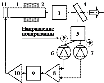 | Рис. 1.10. 1 - излучатель; 2 - постоянный магнит; 3 поляризующий преобразователь; 4 - светоделитель; 5 - поляризационная призма; 6, 7 - фотоприемники; 8 - дифференциальный усилитель; 9 - интегратор; 10 - высоковольтный усилитель; 11 - пьезокорректор с зеркалом |