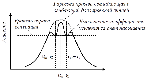 В газоразрядном лазере уширение линии обусловлено эффектом Доплера и является неоднородным. Поэтому вклад в энергию колебаний резонатора дают только атомы с такими скоростями, при которых испускаемое ими излучение подчиняется условиям резонанса. Поскольку колебаниям соответствуют волны, движущиеся в обоих направлениях вдоль оси лазера, вклад в излучение на данной частоте могут давать атомы с двумя составляющими скорости: + v и – v. Таким образом, каждый тип колебаний обедняет населенности двух групп атомов – одной группы со скоростью + v и другой – со скоростью – v. Таким образом, усиление подобной волны идет только за счет атомов, излучение которых соответствует лишь небольшой части доплеровской кривой, и относительное усиление на этой части кривой будет падать при проявлении процессов насыщения. В случае зеркал с одинаковыми коэффициентами отражения это приводит к выгоранию дыр в контуре усиления, расположение которых симметрично относительно центра (рис. 1.12).