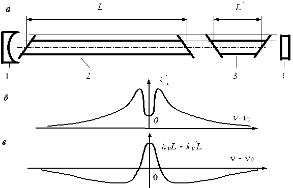 Рис. 1.13. Иллюстрация принципа автостабилизации частоты лазера с помощью поглощающей ячейки: а – схема включения лазера; б – частотная зависимость коэффициента поглощения в ячейке при наличии генерации; в – частотная зависимость суммарного усиления в резонаторе: 1 – глухое зеркало; 2 – трубка с усиливающей средой; 3 – поглощающая ячейка; 4 – выходное зеркало.