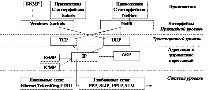 Это набор (стек) протоколов для глобальных сетей. Используется для связи с многими системами (особенно UNIX, последние версии Win 2000 …). Это и протокол Интернет, поэтому он используется практически во всех операционных системах. Он состоит их двух уровней: транспортный и сетевой. На транспортном уровне используются два транспортных протокола: TCP и UDP, на сетевом уровне используется набор протоколов: IP, ARP, ICMP и IGMP. Сам протокол TCP/IP взаимодействует с приложениями 3 типов интерфейсов: SNMP, Sokets, NetBios