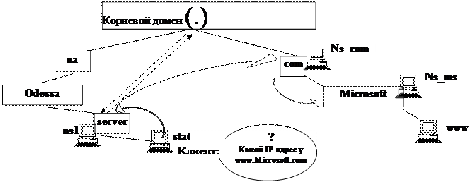 2. При необходимости определить IP-адрес компьютера www.microsoft.com клиент посылает серверу ns1. server.odessa.ua запрос на определение имени. У клиента этот запрос выполняет программа “Определитель”.