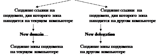 В каждой зоне домена Интернета могут быть созданы ссылки на поддомены этого домена. Эти ссылки позволяют найти нужный домен сети Интернет, начиная с корневого домена. Так, зона корня содержит ссылки на зоны доменов 1 уровня, а зоны 1 уровня содержат ссылки на зоны 2 уровня и.т.д. Поддомен тоже должен иметь свой файл основной зоны. Этот файл может быть расположен на любом компьютере-сервере в глобальной сети. Так, он может быть расположен на том же компьютере, что и основной домен (будем его называть локальный поддомен) или на другом компьютере в сети (будем его называть делегированный поддомен)