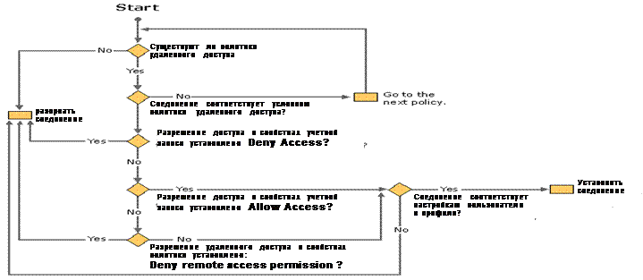 В более ранних версиях ограничения удаленного доступа задавались только в свойствах учетной записи. Политики удаленного доступа появились только в Win2000 и они применяются в комбинации со свойствами учетной записи. С помощью политик можно задавать время доступа, доступ по принадлежности к группе безопасности и.т.д. По умолчанию задана политика Allow Access if Dial-in Permission is Anabled – всем (т.е.доступ определяется по разрешениям учетной записи)
