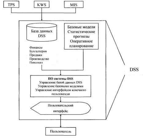 Третий компонент DSS — система ПО DSS, которая обеспечивает простое взаимодействие между пользователями системы, БД DSS и эталонным вариантом. Система ПО DSS управляет созданием, хранением и восстановлением моделей в образцовой основе и интегрирует их с данными в базе данных DSS. Система ПО DSS также обеспечивает графический, простой в использовании, гибкий интерфейс пользователя, которые поддерживает диалог между пользователем и DSS. Пользователи DSS - обычные исполнители или менеджеры. Часто они имеют малый опыт работы с ПК или вообще не имеют его, поэтому интерфейс должен быть дружественным.