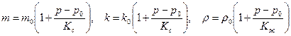 – соответственно пористость, проницаемость и плотность при начальном давлении