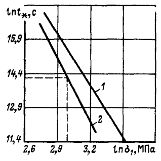 По наклону прямой длительной прочности находим показатель n, а по положению некоторой точки (на рис. 21 ее координаты показаны пунктиром) определяют коэффициент А. для прямой 1: n = 6;