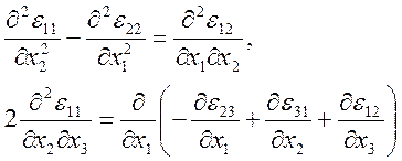 и т.д. (остальные уравнения получаются круговой заменой индексов) при рассмотрении кратковременного напряженно-деформированного состояния тела. При изучении ползучести тела используются шесть аналогичных уравнений совместимости скоростей деформаций