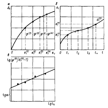 Чтобы определить параметры ползучести, достаточно располагать кривой мгновенного деформирования (рис. 19, а) или хотя бы одной кривой ползучести (рис. 19, б). Измерив на кривой ползучести ординаты