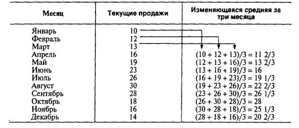 Продажи складских навесов для хранения показаны в средней колонке следующей таблицы. Изменяющаяся средняя за три месяца дана в правой колонке таблицы.