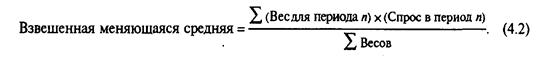 Когда этот метод используется, веса могут предназначаться для придания большего значения текущим данным. Это делается техникой, учитывающей большую способность к изменениям для текущих периодов, которым могут быть приданы более тяжелые веса. Решение, какие веса использовать, требует опыта и момента удачи. Выбор весов чаще всего произвольный, так как не существует формулы их определения. Если для прошлого месяца или периода веса более тяжелые, то прогноз может отразить необычно большие изменения в спросе или продажах более быстро.