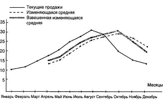Рис. 4.2. Текущие продажи, изменяющаяся средняя и взвешенная изменяющаяся средняя для фирмы складских навесов