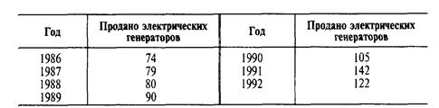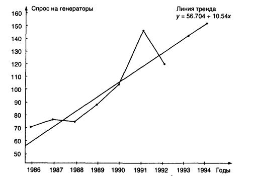 (Продажи в 1994 г.) = 56,70 + 10,54 (9) = 151,56, или 152 генератора. Проверив валидность модели, мы наносим на диаграмму (рис. 4.5) бывший спрос и линию тренда. В этом случае мы можем быть осторожными и попытаться понять колебания в спросе в 1991—1992 гг.