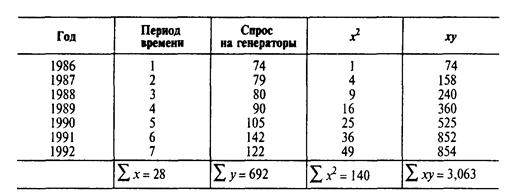 Ниже показаны данные спроса на электрические генераторы компании за период 1986—1992 гг. Подберем прямую линию тренда к этим данным и определим прогноз спроса в 1993 г.