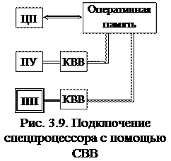 Если подключение спецпроцессора к СОД заранее не предусмотрено, это можно сделать посредством СВВ (рис. 3.9). Такой процессор называют периферийным (ПП). Он подключается к оперативной памяти или системному контроллеру через канал ввода-вывода аналогично периферийному устройству.