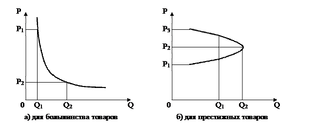 Кривая спроса на рисунке 6.2а показывает, что чем выше цена, тем ниже спрос. При прочих равных условиях покупатель с ограниченным бюджетом откажется от приобретения товара с высокой ценой, если ему будут предложены альтернативные товары по более низкой цене. Однако это соотношение будет другим, если речь идет о сбыте престижных товаров (рисунок 6.2 б). На практике существует много примеров того, что потребители престижных товаров считают, будто рост цен с P1 до P2 вызван улучшением качества этих товаров, соответствием их моде, в результате спрос растет. Но при слишком высокой цене Р3 уровень спроса оказывается ниже Q1 < Q2, чем при цене Р2.