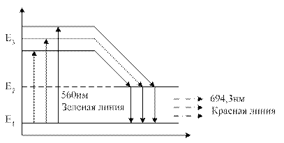 с они самопроизвольно безизлучательно переходят в состояние 2. Время жизни этого уровня велико. Это метастабильный уровень. Здесь скапливается большое число атомов. Уровень 2 оказывается инверсионно заселенным по сравнению с уровнем 1. Возникновение инверсии уровней 2 и 1 способствует малая вероятность спонтанных переходов ионов с уровня 2 на уровень 1. Достаточно одному из ионов хрома перейти из состояния 2 в состояние 1, как начинается лавинообразный процесс лазерной генерации. Длина волны лазерного луча для рубина равна 694,3нм. Эффект усиления света, основанный на индуцированных переходах, можно увеличить путем многократного прохождения усиливаемого света через один и тот же слой усиливающей среды. Для этого торцы рубина делают зеркальными. Рассмотрим фотон, который движется параллельно оси кристалла. Он рождает лавину фотонов, летящих в том же направлении. Часть этой лавины частично пройдет через полупрозрачное зеркало