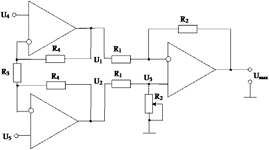 Дифференциальный усилитель на одном ОУ (см. рисунок 4.1) имеет низкое входное сопротивление, которое допустимо при его использовании с низкоомными источниками сигналов, например, с тензометрическим мостом. Однако он непригоден для работы с высокоомными источниками сигналов. В этом случае проблема усиления сигнала решается путем использования инструментального (или измерительного) усилителя, схема которого представлена на рисунке 4.2.