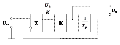 В приведенной схеме интегратор представлен передаточной функцией (подробнее см. курс «Теория автоматического управления»), что облегчает получения уравнения, связывающего входной сигнал Uвх с выходным Uд.