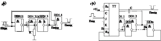 Формирование прямоугольных импульсов заданной продолжительности по фронту или спада входного сигнала осуществляется одновибраторами. Схемы таких формироватей, выполненные на ЛЭ, представлены на рисунке 9.1. Импульсы одновибраторов, собранных по схемам 9.1 а) и г), создаются за счет собственной задержки переключения ЛЭ. В схеме рисунка 9.1 а) выходной импульс появляется в момент появления положительного перепада сигнала на входе запуска и заканчивается, когда через время n tз (n – нечетное число последовательное включенных инверторов, t з – время задержки переключения одного ЛЭ) на втором входе элемента DD1.4 появляется уровень логического нуля.