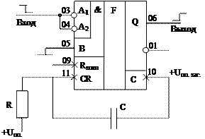 Микросхема К155АГ1, условная пометка которой при запуске спадом импульса показанные на рисунке 9.2 представляет собой одноканальный одновибратор. Продолжительность генерируемого импульса задается RC-цепочкой. Может использоваться или внутренний резистор Rвн = 2 kW, или навесной резистор R, сопротивление которого выбирается в границах