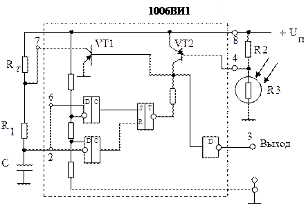 При необходимости получить импульсы со стабильной продолжительностью от нескольких микросекунд до сотен секунд с выходными токами до 200 мА и уровнями логических переменных, согласованными с уровнями ТТЛ и КМОПТЛ элементов, применяют одновибраторы на таймере типа 1006 ВИ1 с внешними времязадающими элементами. На рисунке 9.4 рассмотрено применение таймера как сигнализатора освещенности объекта. При малой освещенности сопротивление фоторезистора R 3 велико и сигнализатор работает в режиме мультивибратора, вырабатывая прямоугольные импульсы продолжительностью