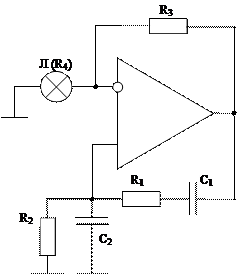 В приведенной схеме для автоматического управления коэффициентом усиления используется лампа накаливания в цепи зворотнього связи. При повышении уровня исходного сигнала нагревается нить лампы, увеличивается сопротивление нити, которая приводит к уменьшению коэффициента неінвертуючого усиления и тем самым к стабилизации амплитуды исходного сигнала генератора.