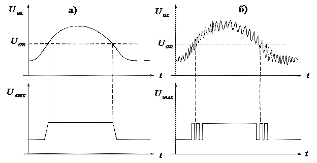 На рисунке 11.6 проиллюстрирована описанная выше ситуация для случая незашумленного входного сигнала а) и для случая входного сигнала с заметным шумом б). Для борьбы с явлением «дребезга» обычно применяется положительная обратная связь, которая охватывает усилитель с большим коэффициентом усиления. Получаем компаратор, у которого уровни включения и выключения не совпадают, а различаются на величину, называемую гистерезисом