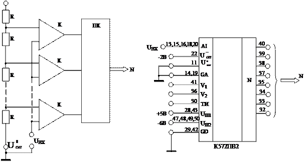 АЦП параллельного преобразования реализуют метод параллельного преобразования и являются наиболее быстродействующими и сложными в реализации АЦП. Упрощенная структурная схема АЦП этого типа представлена на рисунке 16.5. Она включает в свой состав делитель опорного напряжения Uоп, т = 2п компараторов и преобразователь ПК единичного позиционного кода, получаемого с выходов компараторов, в двоичный код N. Источник опорного напряжения Uоп и матрица прецизионных резисторов R обеспечивают напряжение сдвига на входе каждого компаратора, отличающееся на единицу младшего разряда от напряжения сдвига соседних компараторов. На вторые входы всех компараторов подается преобразованное напряжение Uвх. На выходах компараторов формируется цифровой код, число логических «1» в котором определяется числом компараторов, зарегистрировавших превышение Uвх над напряжением сдвига. С помощью преобразователя этому коду ставится в соответствие n-разрядное двоичное слово. Скорость преобразования в параллельных АЦП определяется лишь быстродействием компаратора и логических схем преобразователя. При использовании ТТЛШ-структур время преобразования с помощью параллельного АЦП может составлять ≤ 100 ns. Однако необходимость применения большого числа компараторов (например, при n = 8 нужно 255 компараторов) ограничивает их разрешающую способность.