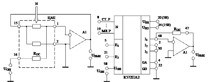 На принципиальных схемах ЦАП удобно изображать условно в виде управляемых кодов сопротивлений и одного постоянного сопротивления Rос. Условное обозначение ЦАП К572ПА1 приведено на рисунке 2.10. Управляющий ЦАП удобно использовать для построения усилителя с управляемым коэффициентом усиления. Действительно, если в рассмотренной схеме (рисунок 2.9) Uоп - это входное, а Uвых - выходное напряжение усилителя, то коэффициент усиления такого инвертирующего усилителя (N/Nmax изменяется прямо пропорционально коду N).
