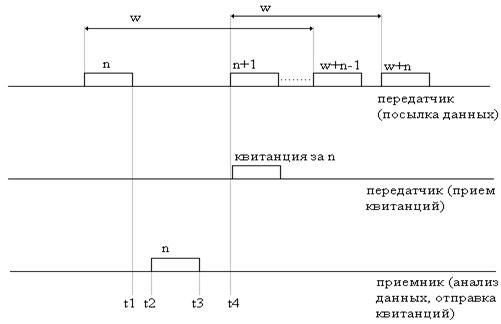 Допустим, что размер окна равен W кадров сообщения. При получении квитанции на очередной кадр передатчиком начало окна сдвигается на следующий кадр. После отправки в сеть кадра с номером n+1 передатчику разрешается отправить еще W-1 кадров до получения квитанции на кадр n+1. Если за это время квитанция получена не будет, то передача приостанавливается, и по истечении некоторого времени тайм-аута кадр (или квитанция на него) считается потерянным. В этом случае W кадров, начиная с n и заканчивая w+n-1, будут переданы заново. Если квитанции поступают относительно регулярно, то скорость передачи методом скользящего окна практически не ограничивается.