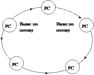 Каждая станция сети непосредственно связана с двумя соседями. Та, от которой данная станция получает данные, называется ближайшим активным соседом выше по потоку, а та, которой передает данные - ближайшим активным соседом ниже по потоку.