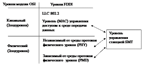 Уровень SMT – Station Management выполняет управление и мониторинг стека протоколов FDDI. В отличие от Token Ring, здесь нет активного монитора, и в управлении кольцом принимают участие все станции, которые обмениваются кадрами SMT для управления и контроля над сетью. Например, при первоначальном подключении узла (станции или концентратора) к сети под управлением протокола SMT выполняется процедура физического соединения, которая состоит в последовательном тестировании правильности соединения и качества новых связей.