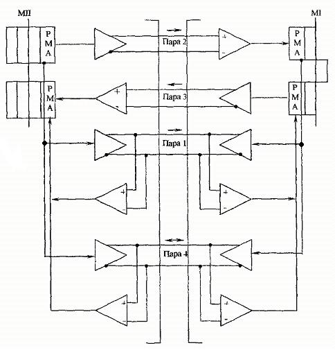 В этой спецификации используется пара категории 3 с целью применения уже проложенного в здании телефонного кабеля и кабеля 10 Base T (рис.4.19.). Может использоваться также витая пара категории 4 и 5. Поначалу спецификация получалась более дорогой, чем ТХ, поскольку была сложнее. И вообще, спецификация оказалось не слишком популярной из-за низкой помехозащищенности, большей зависимости от неисправностей кабеля.