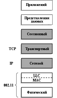 Рис. 4.25. Уровни модели ISO/OSI и их соответствие стандарту 802.11.