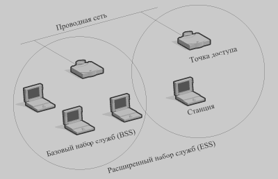 Стандарт IEEE 802.11 определяет два режима работы сети – режим Ad-hoc-"точка-точка" и клиент/сервер (или режим инфраструктуры – infrastructure mode). В режиме клиент/сервер (рис. 2) беспроводная сеть состоит, как минимум, из одной точки доступа, подключенной к проводной сети, и некоторого набора беспроводных оконечных станций. Такая конфигурация носит название базового набора служб (Basic Service Set, BSS). Два или более BSS, образующих единую подсеть, формируют расширенный набор служб (Extended Service Set, ESS). Базовые станции могут быть связаны между собой либо той же беспроводной средой (радио- или инфракрасная передача) либо проводной средой. В задачи ESS входит объединение станций, принадлежащих разным BSS. В этом случае станция одной BSS передает данные своей точке доступа, передающей их другой точке доступа, к которой подключена станция – получатель. ESS-сеть обеспечивает станциям мобильность – они могут переходить из одной BSS в другую. Эти перемещения обеспечиваются функциями уровня МАС рабочих станций и точек доступа и не заметны для вышележащих протоколов.