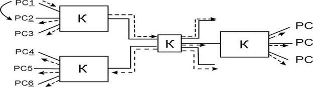 Если PC1 надо передать данные PC2, то эти данные будут передаваться по всей сети, т.к. повторитель – аналог «общей шины», и в этот момент никакая из других PC ничего передавать не может, т.к. будет ожидать освобождение разделяемой среды.