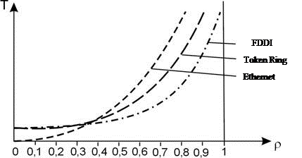 Как видно из рисунка, всем технологиям присущ экспоненциальный рост величины задержек доступа при увеличении коэффициента использования сета, отличается только порогом, при котором наступает резкий перелом в поведении сети, когда почти прямолинейная зависимость переходит в крутую экспоненту. Для всего семейства технологий Ethernet — это 30-50%, для технологии Token Ring – 60 %, для технологии FDDI – 70 %.