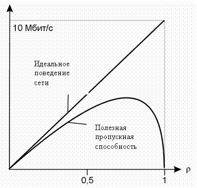 Рис. 5.3. Зависимость полезной пропускной способности сети Ethernet от коэффициента использования