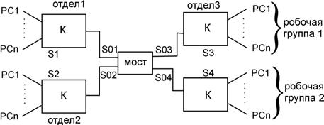 На предприятии есть 3 отдела. Один из отделов включает в себя 2 рабочие группы. Вся сеть разделена мостом на 4 сегмента (подсети).