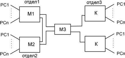 Большинство крупных сетей строится на основе структуры с общей магистралью, к которой через мосты, коммутаторы, маршрутизаторы присоединены подсети (сегменты) разных отделов. Подсети отделов могут делиться на сегменты для обслуживания рабочих групп.