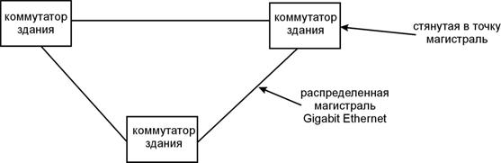 В качестве магистральной могут использоваться технологии: Fast и Gigabit Ethernet, ATM, FDDI. В настоящее время наиболее часто используется Ethernet, реже – ATM. Распределенная магистраль упрощает связь между этажами, уменьшает стоимость кабельной системы, преодолевая ограничения на расстояния. Однако, скорость магистрали ограничена скоростью протокола, поддерживаемого портами коммутатора, которая всегда меньше, чем у стянутой в точку магистрали. Поэтому необходимо учитывать интенсивность трафика между этажами и зданиями, а также стоимость реализации самой технологии.