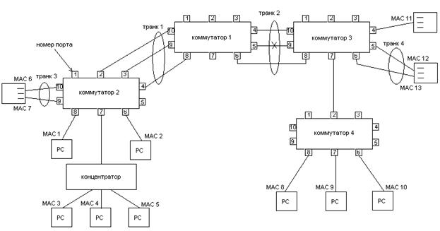 После конфигурирования коммутаторов не будет возникать размножение и зацикливание кадров с неизвестными, широковещательными и групповыми адресами в линиях транка, которые иначе воспринимались бы как петля. Теперь любой кадр, который нужно послать в агрегированный порт (с известным адресом или широковещательный) будет послан только в один из физических портов транка.