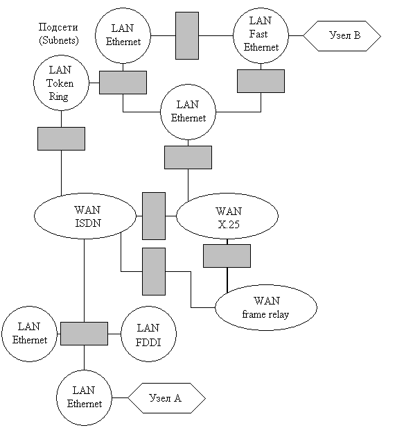 Чтобы передать пакет от узла А к узлу B в составной сети (рис.7.1.), необходимо использовать средства сетевого уровня.