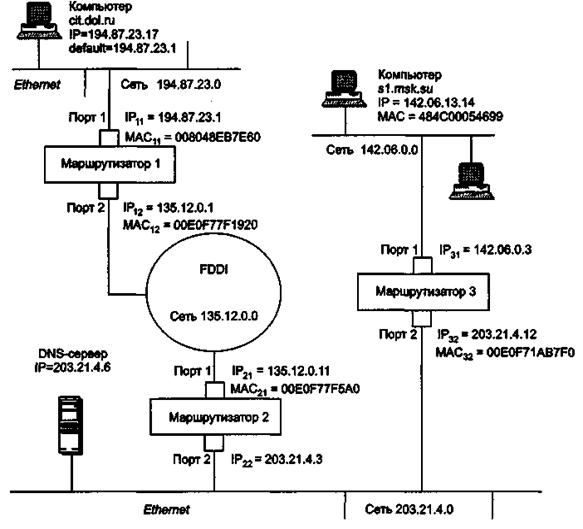 1. Итак, пусть пользователь компьютера cit.dol.ru, находящегося в сети Ethernet и имеющего IP-адрес 194.87.23.17 (адрес класса С), обращается по протоколу FTP к компьютеру sf.msk.su, принадлежащему другой сети Ethernet и имеющему IP-адрес 142.06.13.14 (адрес класса В).