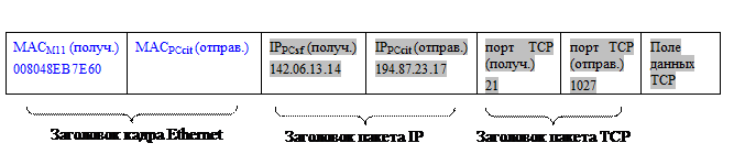 10. Сетевой адаптер компьютера sf.msk.su захватывает кадр Ethernet, обнаруживает совпадение МАС-адреса, содержащегося в заголовке, со своим собственным адресом и направляет пакет модулю IP. После анализа полей IP-заголовка из пакета извлекаются данные, которые содержат сообщение вышележащего протокола. Поскольку в данном примере рассматривается обмен данными по протоколу FTP, который использует в качестве транспортного протокола TCP, то в поле данных IP-пакета находится TCP-сегмент. Определив из TCP-заголовка номер порта получателя 21, модуль IP переправляет сегмент в соответствующую очередь, из которой данный сегмент попадет программному модулю FTP-сервера.
