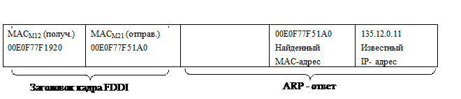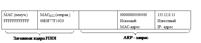 7. Маршрутизатор 1 просматривает параметры порта 2 и находит, что к нему подключена сеть FDDI. Так как сеть FDDI имеет значение MTU большее, чем сеть Ethernet, то фрагментация IP-пакета не требуется. Поэтому маршрутизатор 1 формирует кадр формата FDDI. На этом этапе модуль IP должен определить МАС-адрес следующего маршрутизатора по известному IP-адресу 135. 12. 0. 11. Для этого он обращается к протоколу ARP. Допустим, что нужной записи в кэш-таблице не оказалось, тогда в сеть FDDI отправляется широковещательный ARP-запрос, содержащий наряду с прочей следующую информацию: