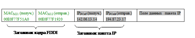 Теперь, зная МАС- адрес следующего маршрутизатора 00E0F77F51A0, маршрутизатор 1 отсылает кадр FDDI по направлению к маршрутизатору 2. Заметим, что в полях IP-пакета никаких изменений не произошло.